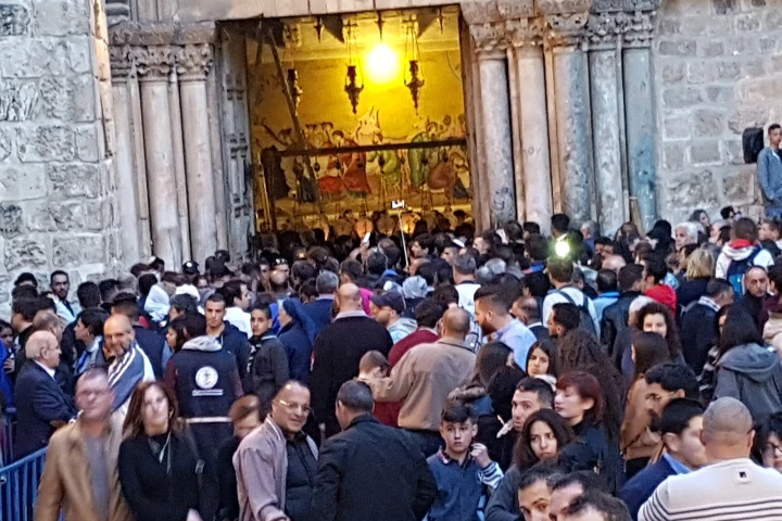 In der Grabeskirche ist es verhältnismäßig ruhig am Ostermorgen. Einzelne Pilger und Gruppen aus aller Welt strömen zum Grab, um auf ihre ganz eigene Art und Weise zu beten und zu gedenken. Einige sitzen still in der Ecke, andere singen und tanzen. Eine Gruppe von orthodoxen Pilgern hat sich vor dem Grab versammelt und stimmt gemeinsam in lautem Ton Kirchenlieder an.