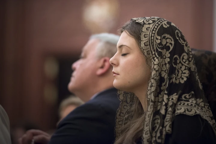 "Beten ist daher nicht bloßes Geschenk, sondern eine Grundhaltung des Christen, die erlernt und vertieft, geübt und erprobt werden will." – Eine junge Katholikin beim Gebet in der Heiligen Messe zur Beerdigung von Mutter Angelica am 1. April 2016.