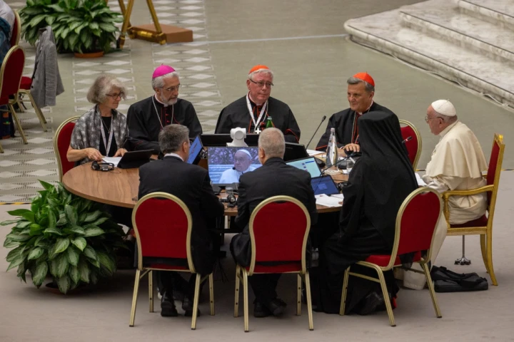 Diejenigen, die eine Eröffnungsansprache hielten, einschließlich Papst Franziskus, taten dies im Sitzen. Kameras an jedem Tisch fingen das Bild der Redner ein und zeigten sie nicht nur auf einer großen Leinwand im vorderen Teil des Raumes, sondern auch auf den vier Bildschirmen an jedem runden Tisch.