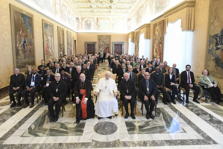 „Liebe Freunde, das Thema, mit dem Sie sich befassen, ist in der Tat eine Herausforderung, ebenso wie die beiden Wege, auf denen Sie es angehen wollen“, sagte Franziskus. „Zum einen erkenne ich, dass Sie sich um einen wirksamen Dialog bemühen, um einen interdisziplinären Austausch in der Form, die Veritatis Gaudium beschreibt als ‚Verortung und Anregung aller Disziplinen vor dem Hintergrund des Lichts und des Lebens, das die aus Gottes Offenbarung strömende Weisheit bietet‘.“