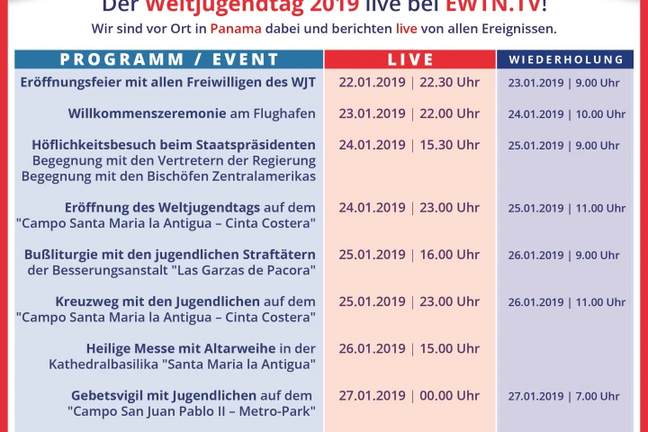 Der Weltjugendtag wurde 1984 von Papst Johannes Paul II. ins Leben gerufen und fand seitdem 33 Mal statt, zuletzt 2016 in Krakau, Polen. Das Jugendtreffen in Panama steht unter dem Motto: „Siehe, ich bin die Magd des Herrn; mir geschehe, wie du es gesagt hast (Lk 1,38)“. EWTN wird auch abseits der Live-Sendungen vom Jugendtreffen berichten und hat dafür einen Blog auf www.panama19.de eingerichtet. Zusätzlich werden Sie auch über die Social-Media-Kanäle auf Facebook, Twitter und Instagram auf dem Laufenden gehalten.