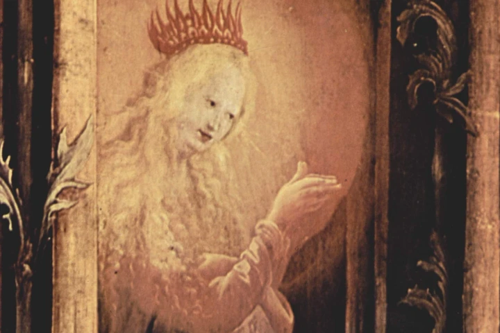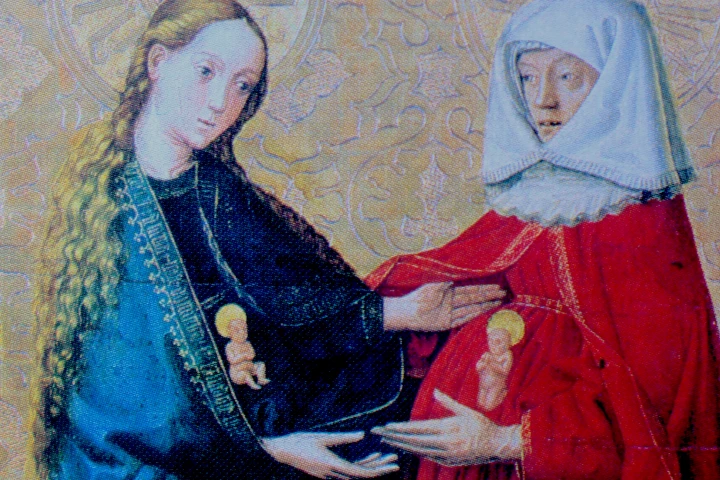 Auf derselben Tafel sehen wir das erste Zeichen Seines Erbarmens. Den zwei großen männlichen Himmelsgestalten werden nun zwei kleinere irdische weibliche Menschengestalten beigesellt: die hochschwangere rotgewandete Matrone Elisabeth und die schmale, leuchtend blau gekleidete Jungfrau Maria. Vor ihren Leibern, als Winzlinge, die beiden noch ungeborenen Kinder . Der Christusknabe mit Nimbus thronend, und der Johannesknabe kniend als Vorläufer des Herrn. „Und das Kind hüpfte vor Freude in meinem Leibe“, spricht Elisabeth. Und Maria wird im „Magnificat“ den Herrn preisen. Bei Gott ist nichts unmöglich.
