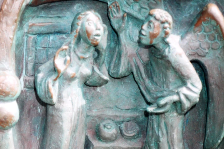 Annuntiatio: Der Engel des Herrn brachte Maria die Botschaft. Auf der Ostfrieseninsel Borkum wurde 1905, erweitert 1987, die katholische Kirche Maria Meeresstern erbaut. Beim Eintreten ergreifen wir den bronzenen Griff und halten inne: Ein kleines ovales Relief mit der Verkündigung lässt die Hand sich lösen und den eisigen Inselwind für eine Weile vergessen. Eine ostfriesische Bürgersstube. Butzenscheiben, ein kleiner geschürter Herd. Da steht die einfache Frau Maria offenen Mundes und mit staunend geöffneten Augen, die Rechte ans Ohr gelegt, den Kopf nach oben gewandt, die Rechte wie zur Aufnahme bereit. Vor ihr der Engel.