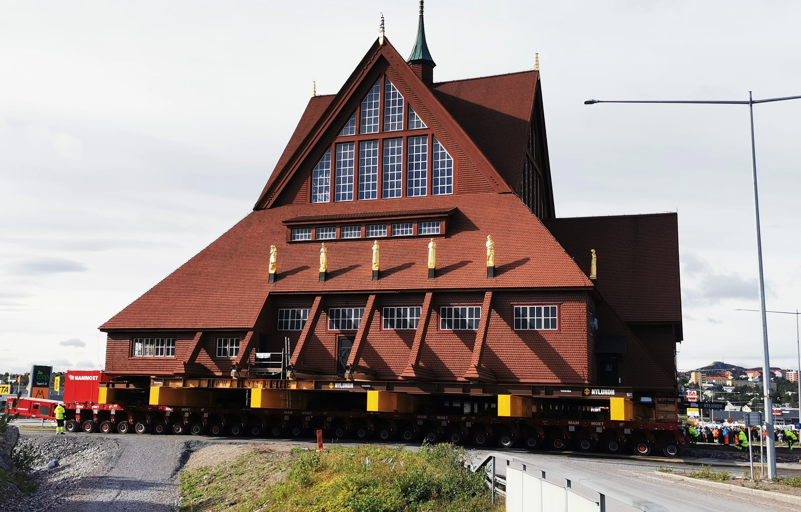Das bekannte rote Gotteshaus gilt als Wahrzeichen und „Seele“ der nordschwedischen Bergbaustadt Kiruna. Mit speziellen Schwerlastfahrzeugen wurde das 672 Tonnen schwere Gebäude Schritt für Schritt zu seinem neuen Standort transportiert – in Schrittgeschwindigkeit von etwa 500 Metern pro Stunde.