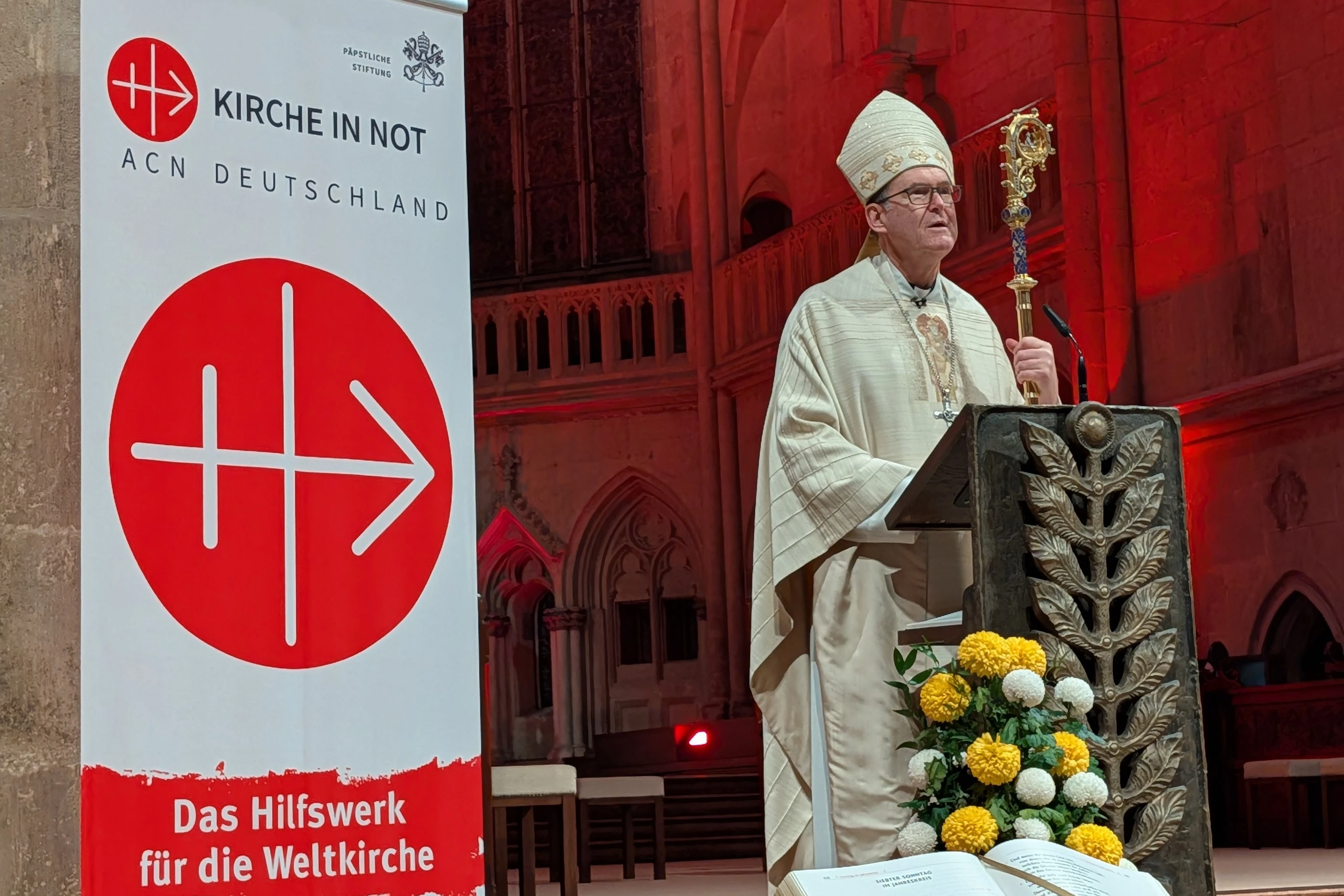 Als Vertreter von „Kirche in Not“ dankte Pater Benedikt Eble CP dem Bistum für die Gastfreundschaft am „Red Wednesday“ und erläuterte, wie die an diesem Abend erbetene Hilfe konkret aussehe: „In über 130 Ländern unterstützt ‚Kirche in Not‘ weit über 5.000 Hilfsprojekte.“ So mache das Hilfswerk vielerorts die Priesterausbildung erst möglich, leiste finanzielle Hilfe für Ordensfrauen, fördere den Aufbau von Gemeindezentren und Kirchen und unterstütze die kirchliche Medienarbeit. „Aufgrund unseres pastoralen Schwerpunkts tun wir das ganz ohne öffentliche Gelder oder Kirchensteuermittel“, ergänzte Pater Eble.