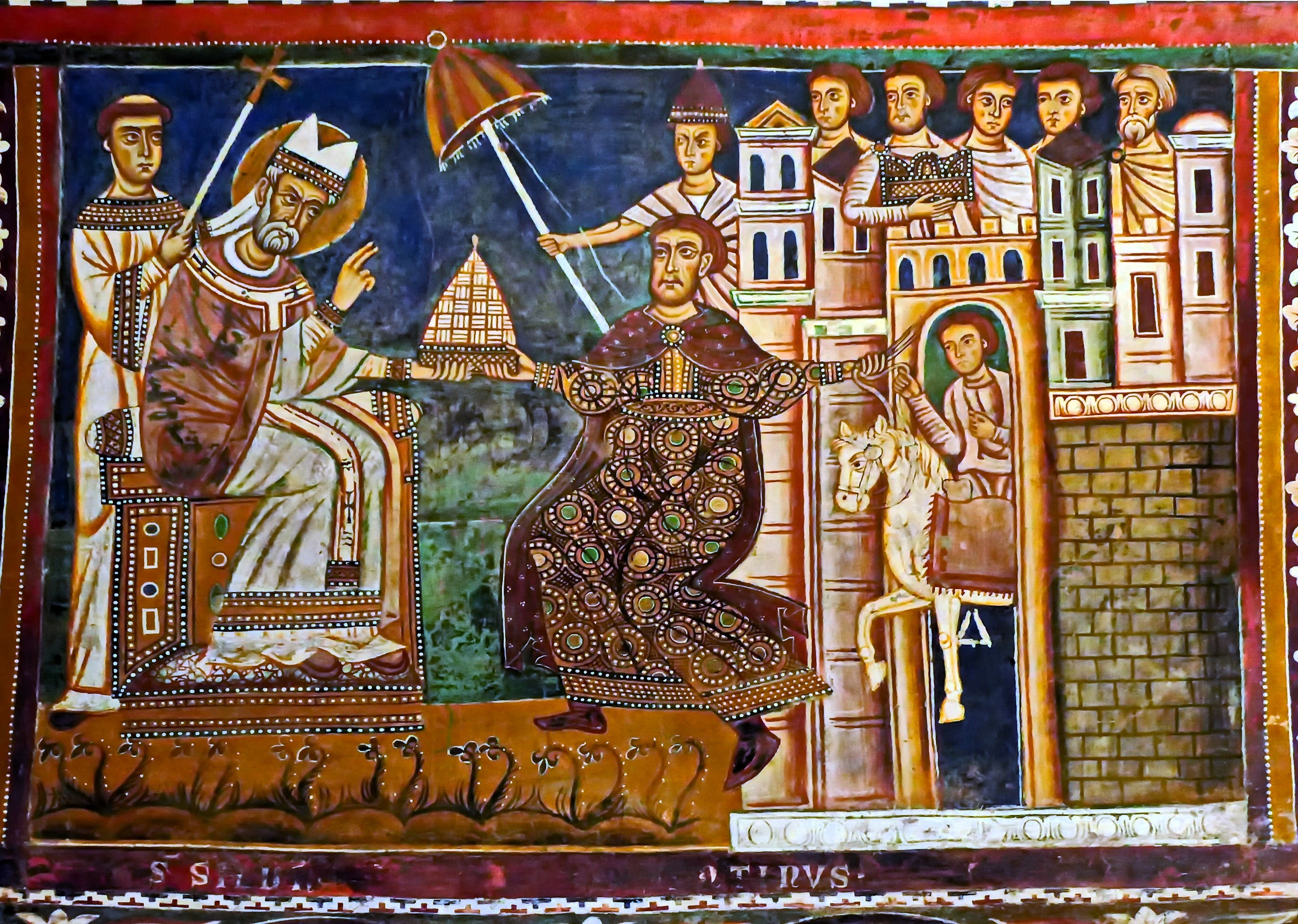 Silvester erhält von dem vor ihm knienden Kaiser Konstantin die Insignien der weltlichen Macht über die Stadt Rom.