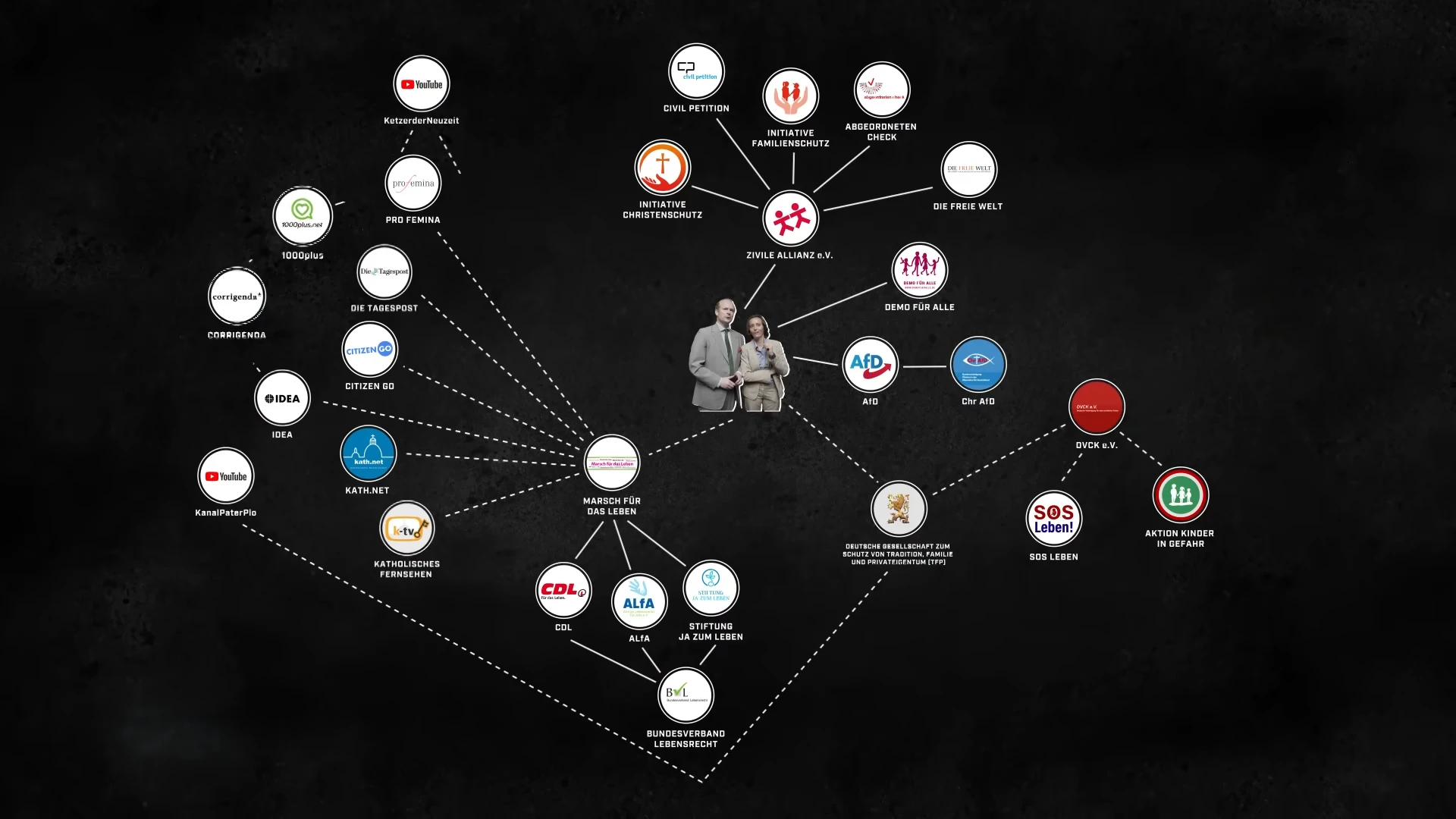 Dabei wurde bewusst die Bildsprache kriminalistischer Ermittlungen verwendet. Vor schwarzem Hintergrund sind zentral die AfD-Politikerin Beatrix von Storch und ihr Mann zu sehen, umgeben von gestrichelten Verbindungslinien, wie man sie aus polizeilichen Ermittlungs-Diagrammen kennt. Rundherum spannt sich ein Netz aus Logos verschiedener Pro-Life-Organisationen und christlicher Medien.